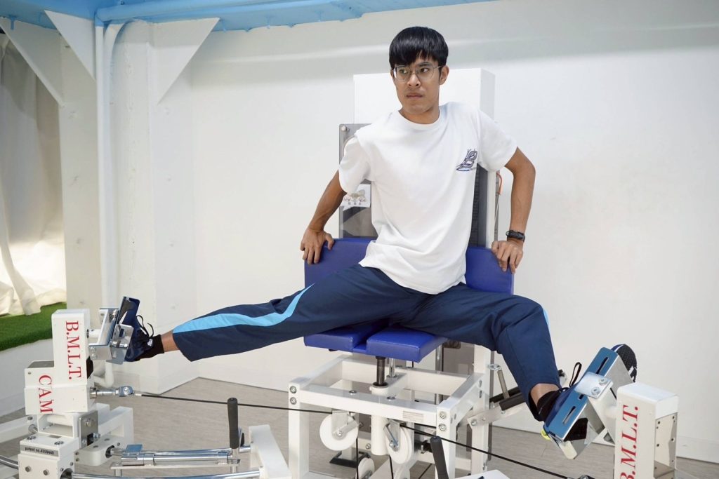 保持開腿狀態的同時,向”身體橫向”伸腿與骨盆連動的動作,加強髖關節及骨盆周邊的肌肉和神經,包含內收肌群(大腿內側)和臀部的肌肉。改善髖關節的靈活性、提升身體平衡的機器。